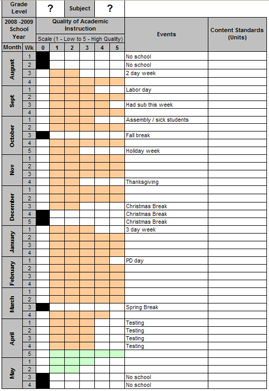 This simple Excel file provides an opportunity for groups of educators to look at the school calendar within the context of academic instruction quality. Administration can use file to monitor academic time specific to grade levels or student groups. Teachers can correlated when content standards / units of study are addressed and look at possible academic factors have on SOPIs.